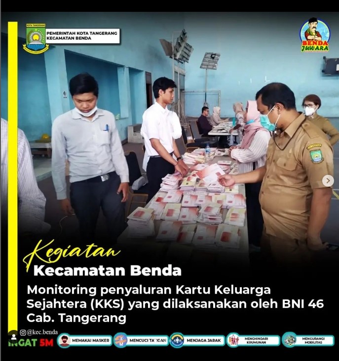 sekcam Benda Bpk. @pacerizwan bersama Kepala Seksi Kemasyarakatan Kecamatan Benda melaksanakan monitoring Penyaluran Kartu Keluarga Sehat (KKS) tahun 2021 yang dilaksanakan oleh Bank BNI Cabang Tangerang di GOR Kecamatan Benda.