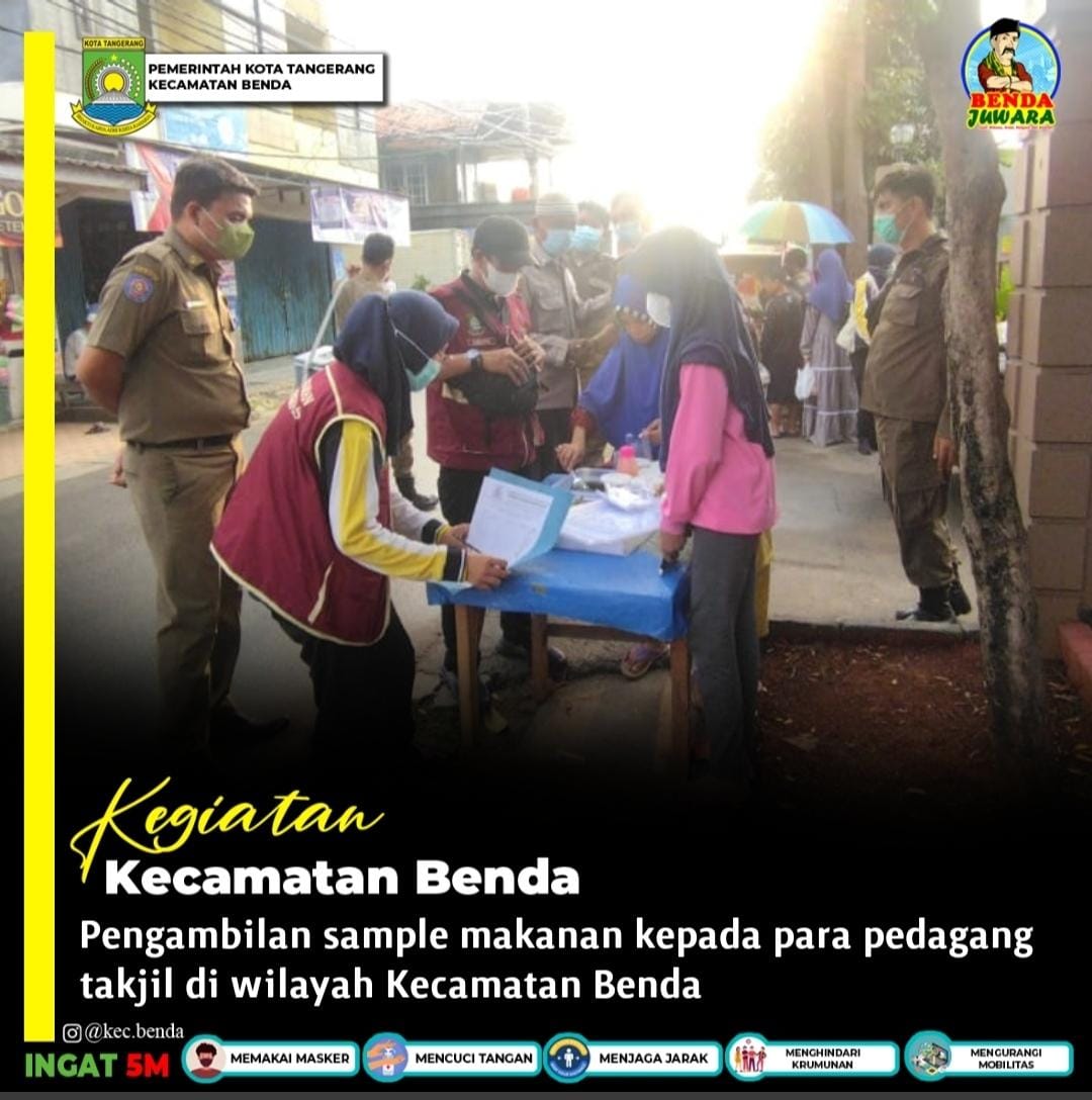 Anggota Tramtib Kecamatan Benda mendampingi petugas dari Dinas Kesehatan Kota Tangerang yang melaksanakan pengambilan sample makanan kepada para pedagang takjil di sekitar wilayah Kecamatan Benda Kota Tangerang.